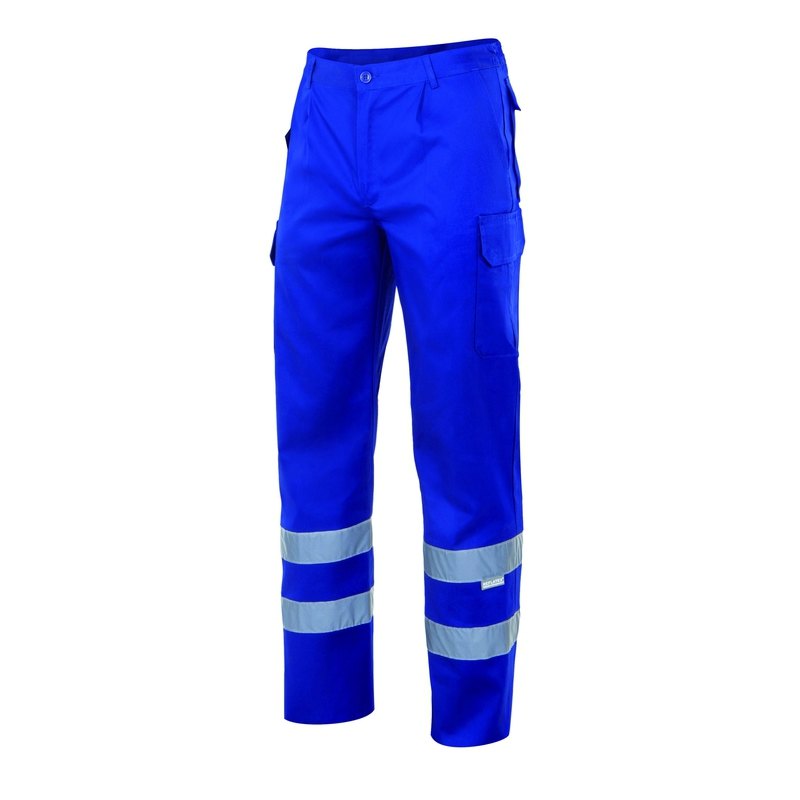 Pantalón multibolsillos con cintas reflectantes en el bajo de las piernas. Goma elástica en el interior de la cinturilla de la espalda y varios bolsillos. Pespunte trasero de seguridad. Sarga. 65% poliéster – 35% algodón. Gramaje 190 gr/m2.